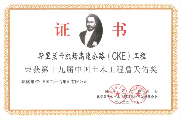 9月5日,第十九届中国土木工程詹天佑奖颁奖大会在北京召开,斯里兰卡机场高速公路(CKE)工程作为中国二十冶“一带一路”上建造唯一的市政工程获此殊荣。